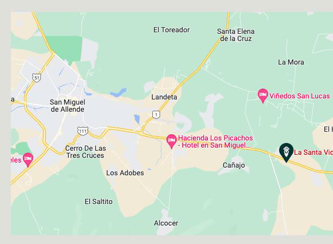 Ubicado en el km 24.2 de la carretera Querétaro – San Miguel de Allende, a 9.5 km y a 10 min. del centro de San Miguel de Allende